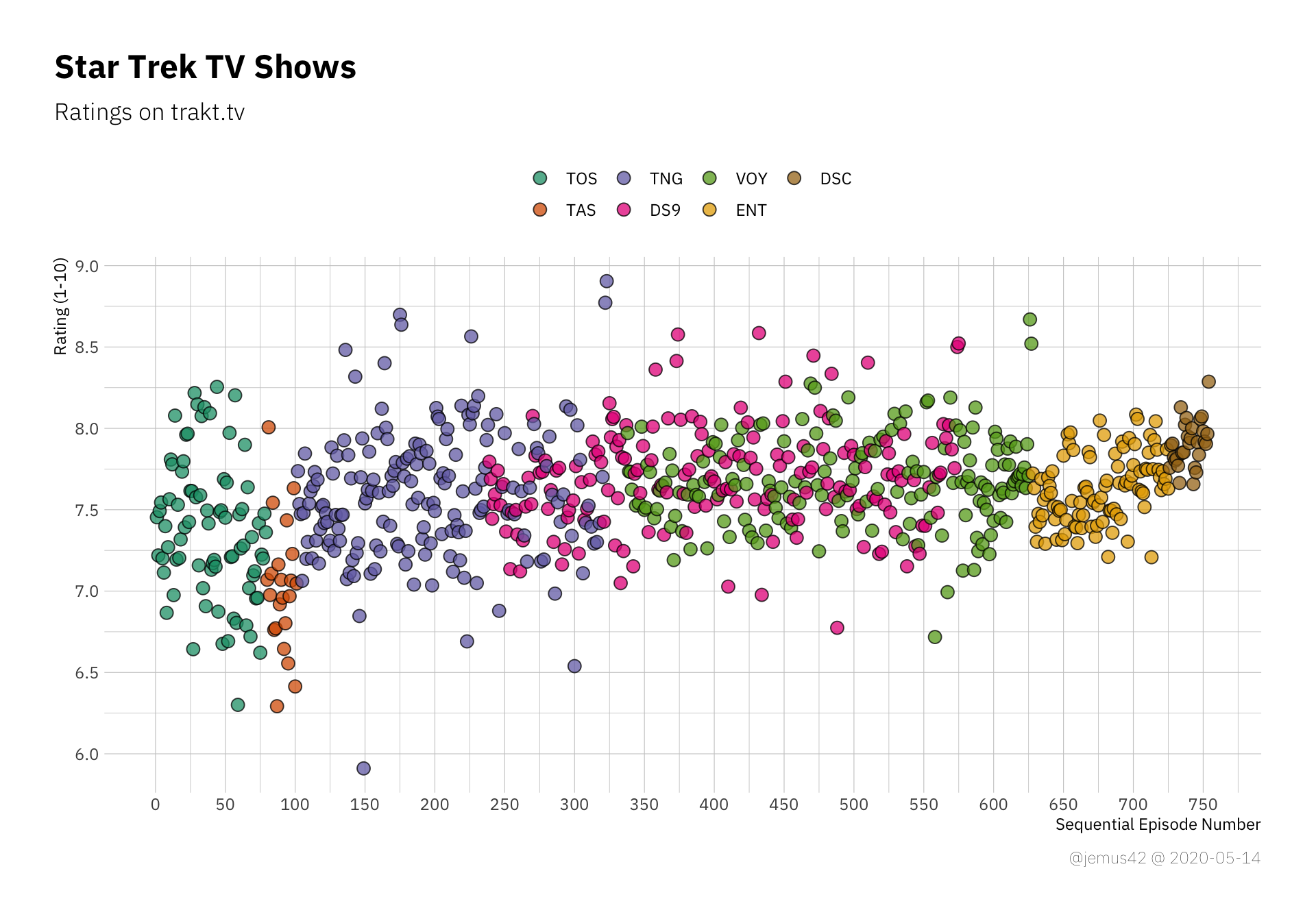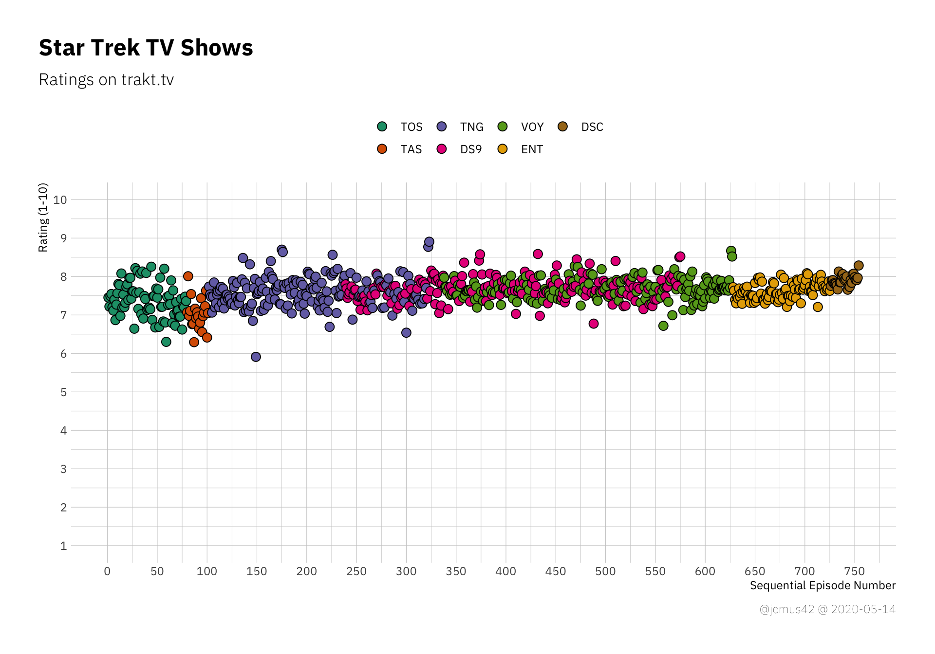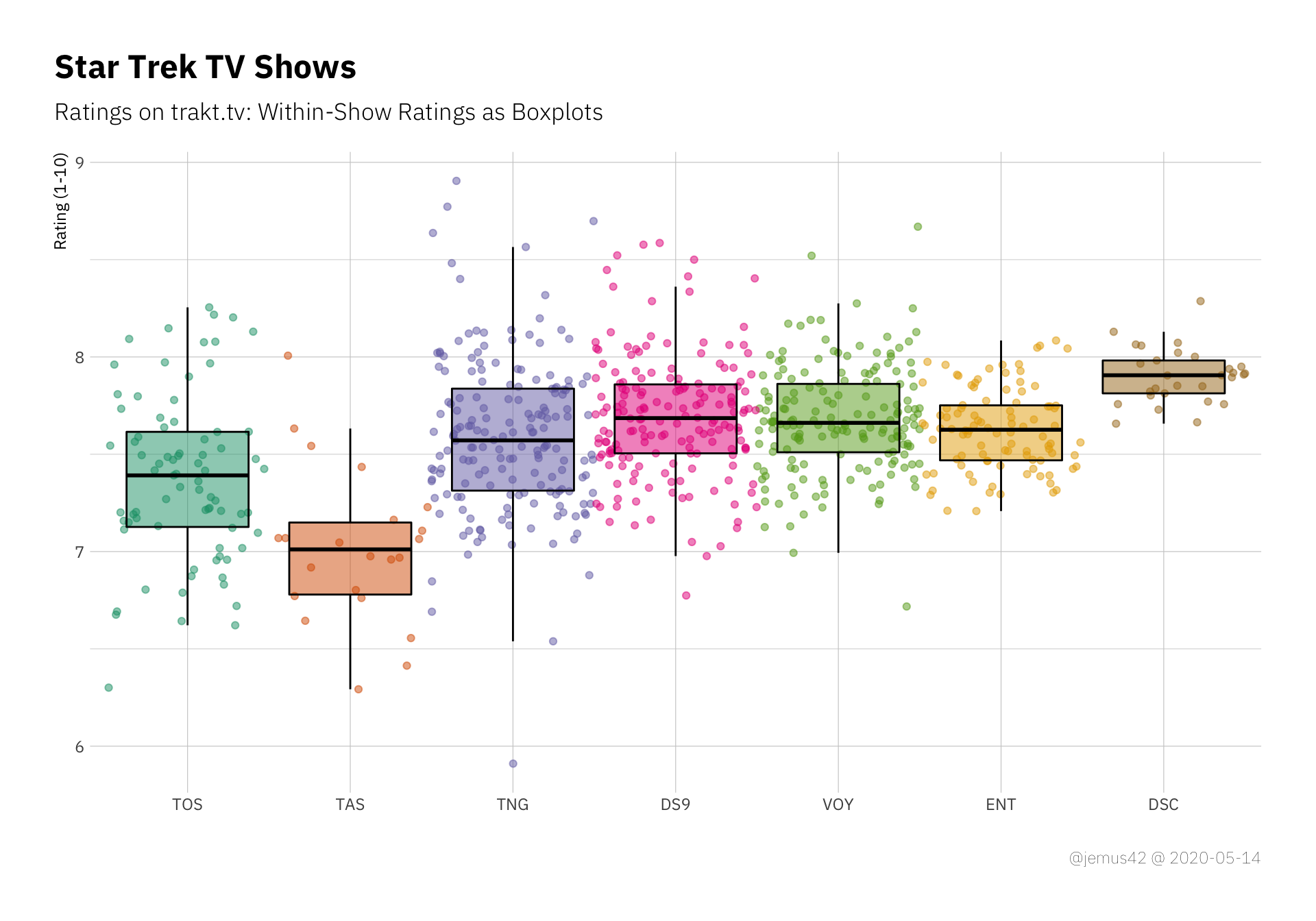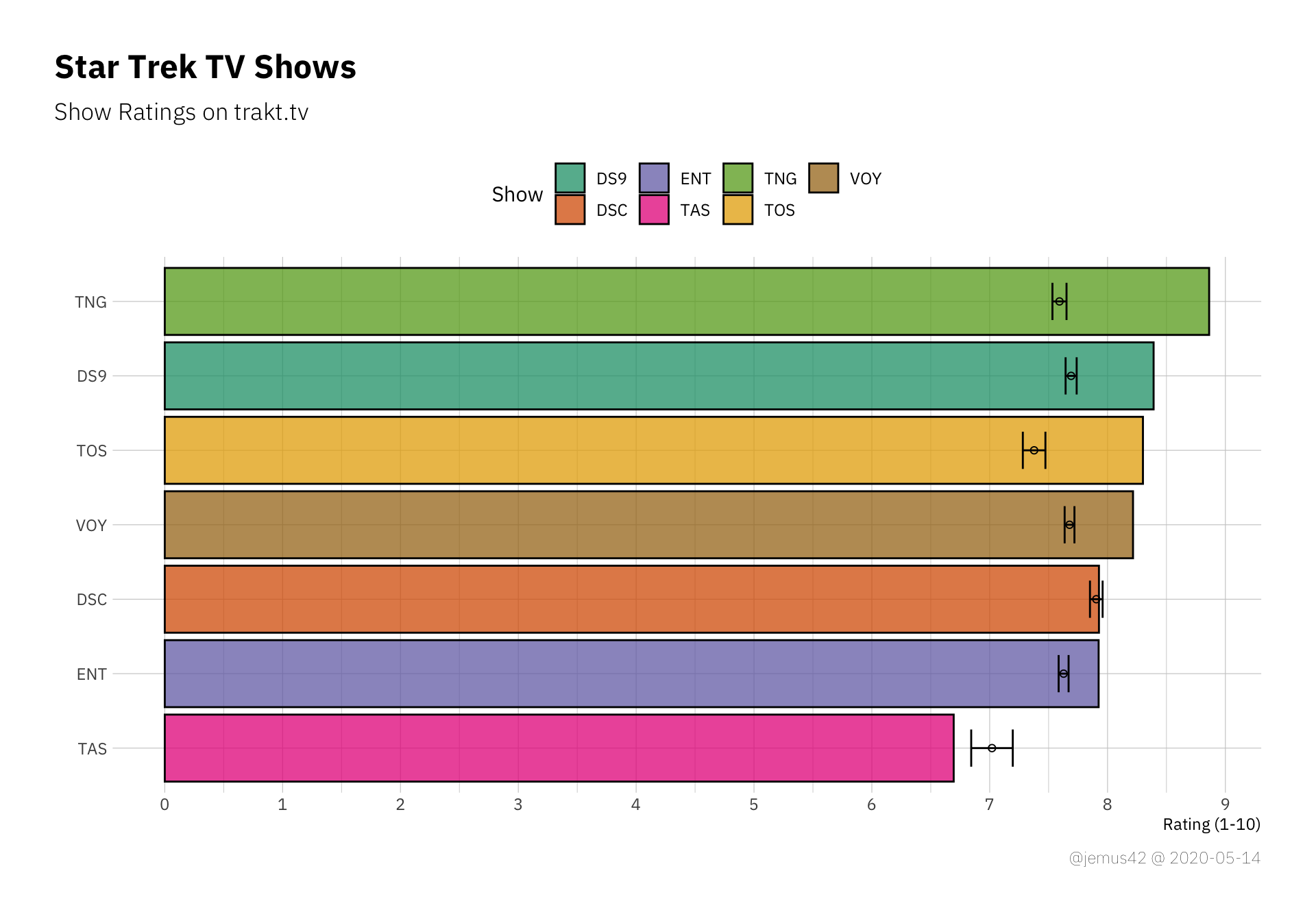 Neat. These little tie-fighters (wrong franchise, I know) represent the mean episode rating with its confidence interval. What we can learn from that plot is how TNG has a high show rating, but individual episodes tend to be rated lower on average when compared to the over-all show rating. Interestingly, it’s the other way around fpr TAS, where the average episode rating is higher than the show rating, so apparently people who remember it liked it better than the people who watched it? Not quite sure, but I’m certain you can figure out a way to rationalize this effect, I’m out ¯\_(ツ)_/¯