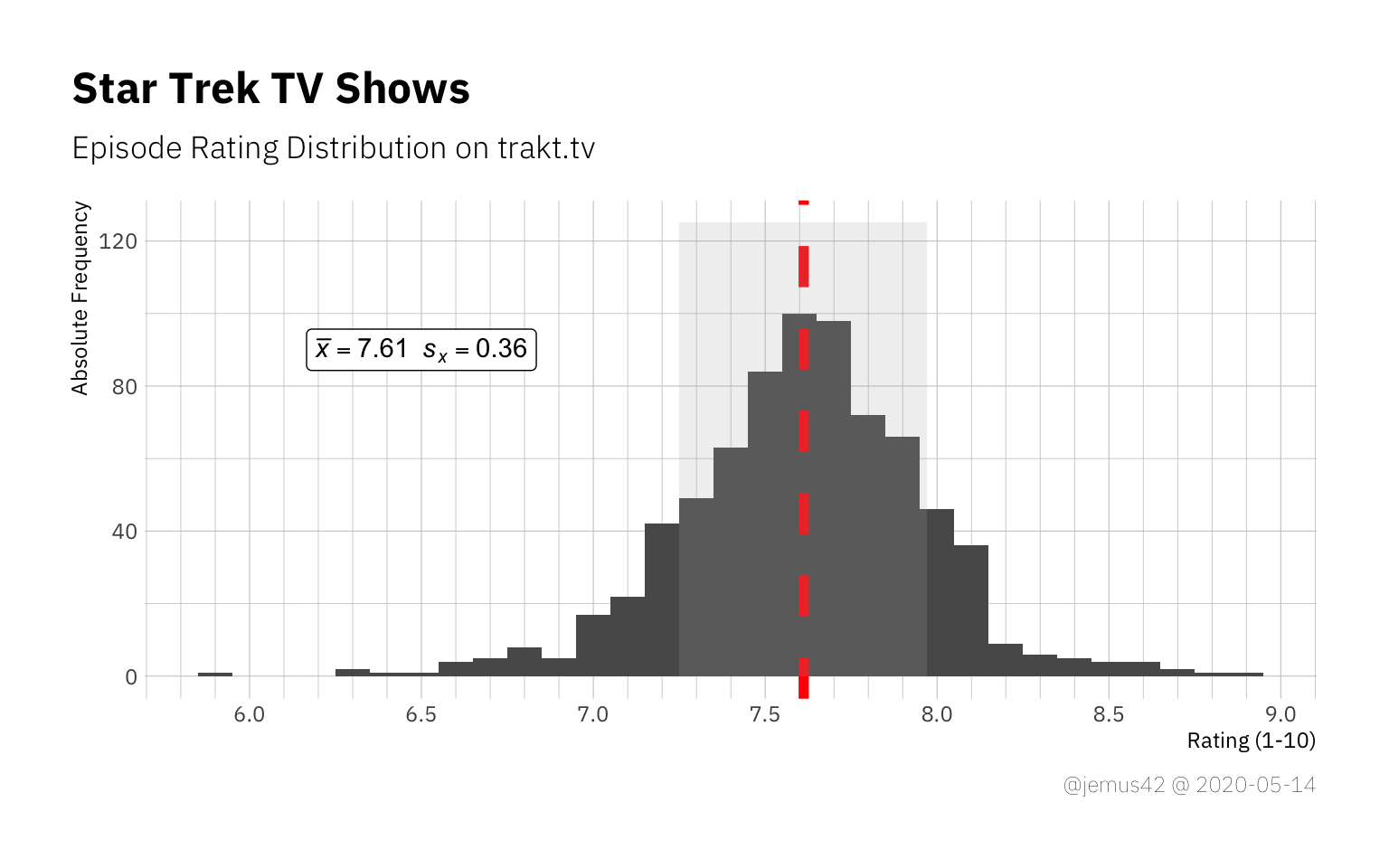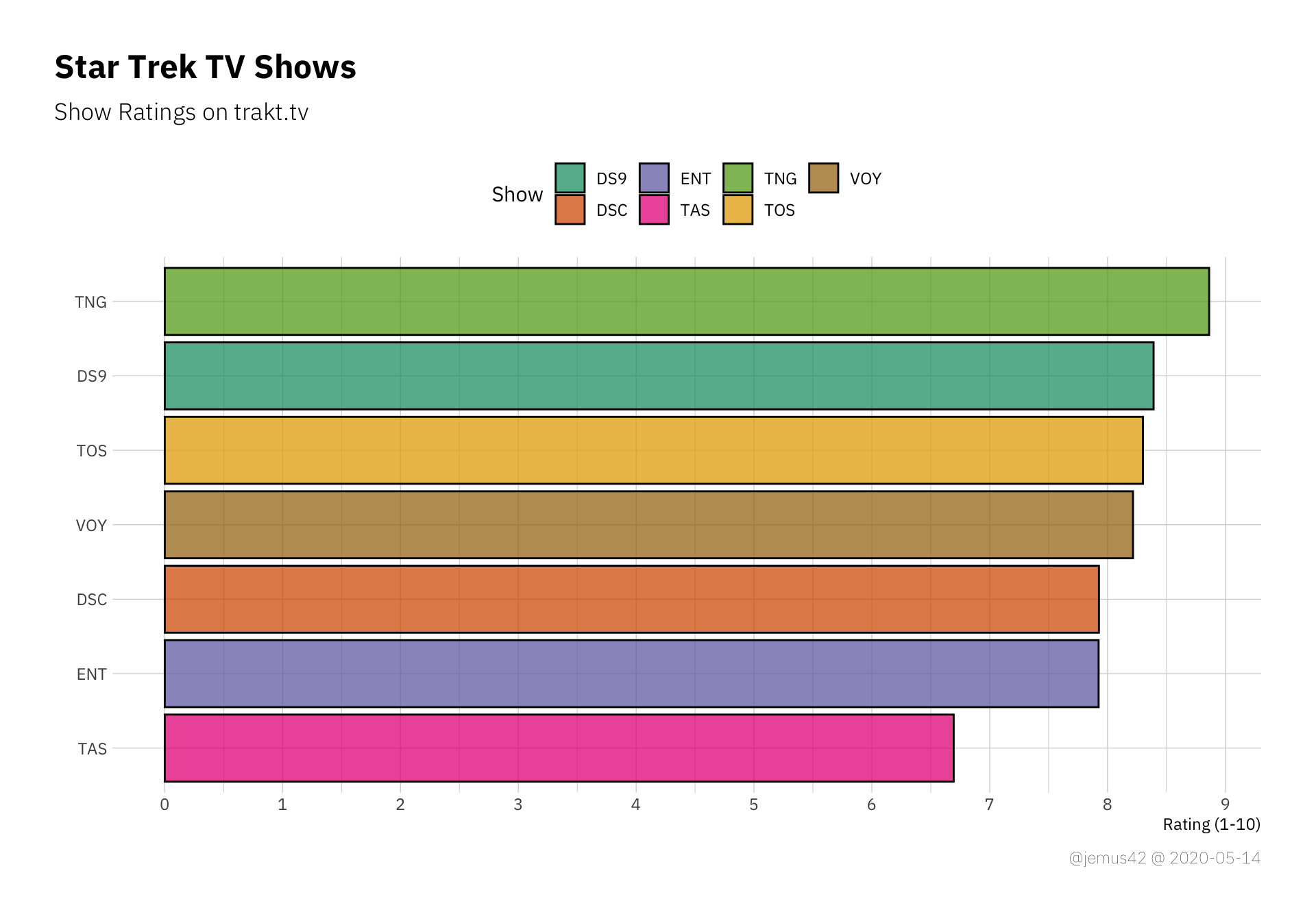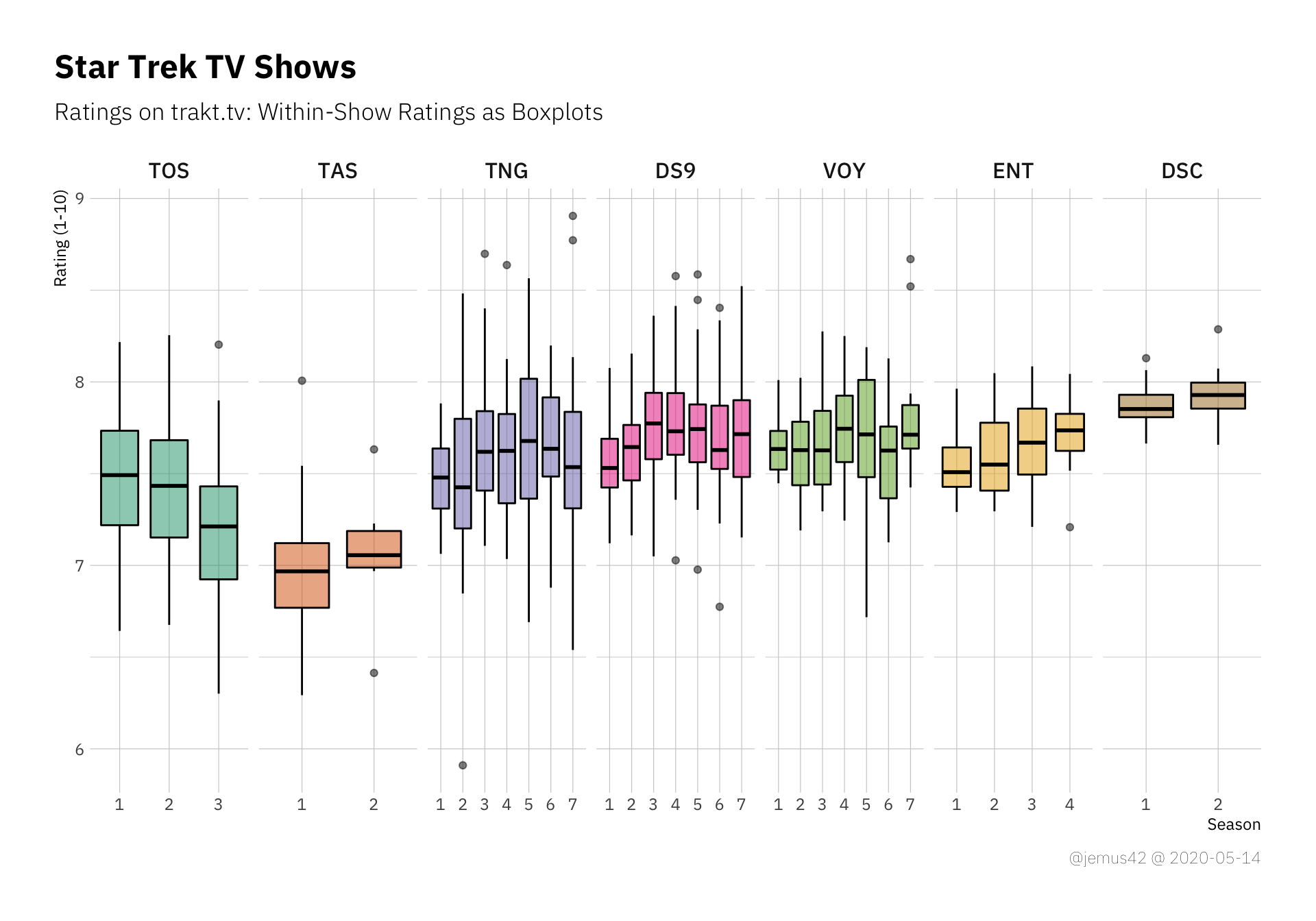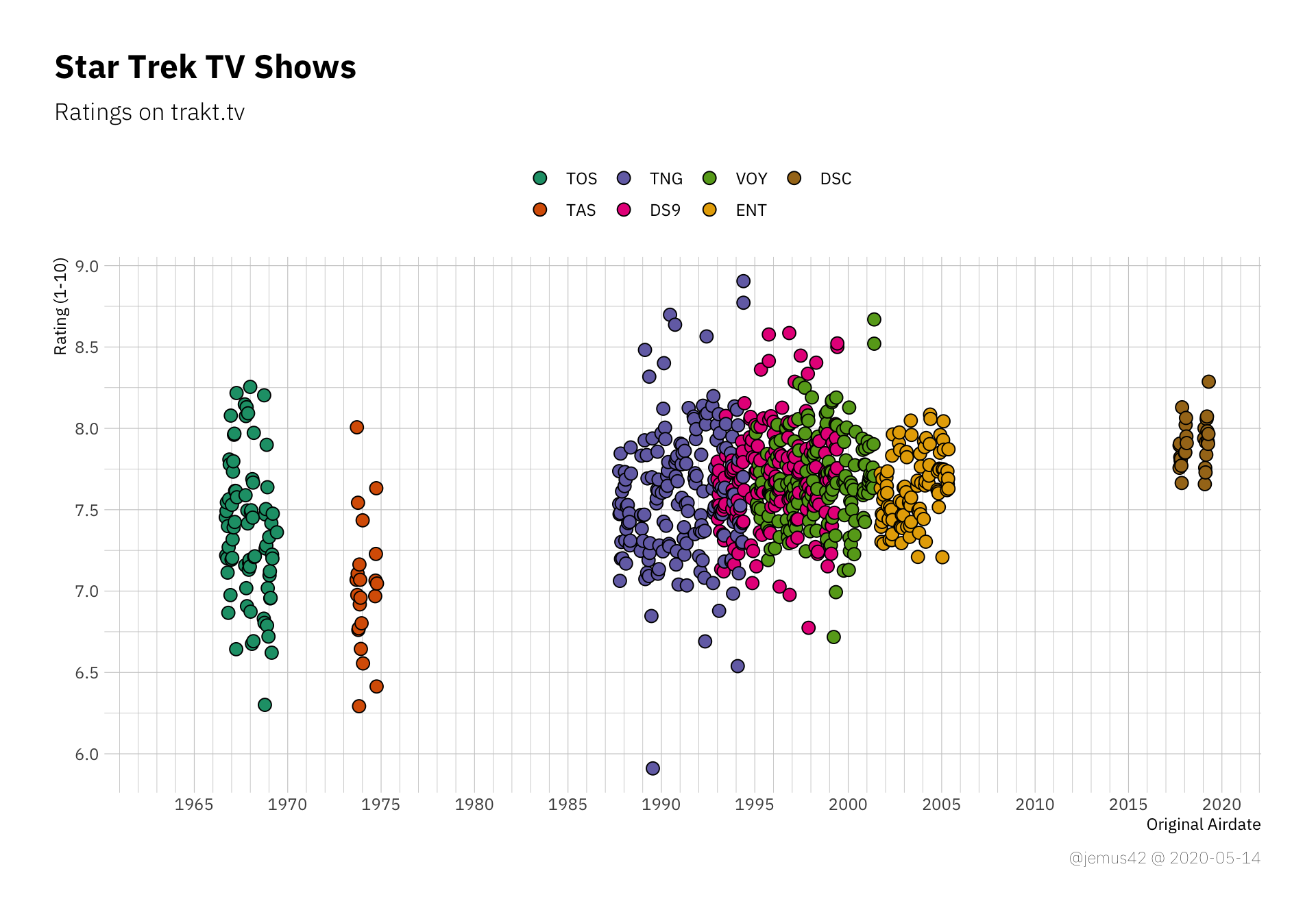 Neat. These little tie-fighters (wrong franchise, I know) represent the mean episode rating with its confidence interval. What we can learn from that plot is how TNG has a high show rating, but individual episodes tend to be rated lower on average when compared to the over-all show rating. Interestingly, it’s the other way around fpr TAS, where the average episode rating is higher than the show rating, so apparently people who remember it liked it better than the people who watched it? Not quite sure, but I’m certain you can figure out a way to rationalize this effect, I’m out ¯\_(ツ)_/¯