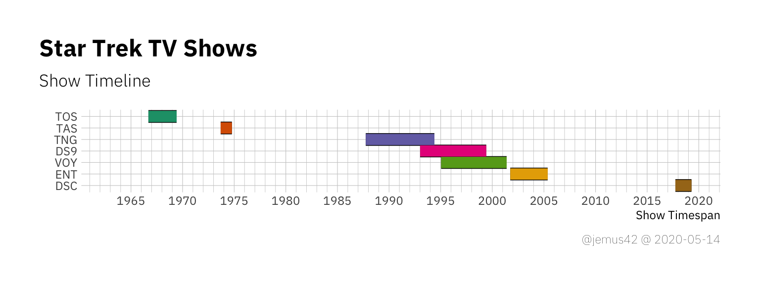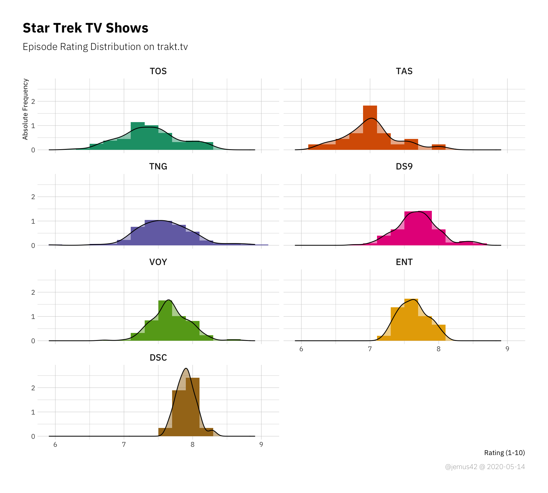 Star Trek. It’s a thing. Not only is it a thing, it’s also a big franchise. You might have heard of it. If you happen to fall into my sociodemographic bracket, you might not have particularly strong feelings about it, but you’re probably aware that many people do. I for one do not really care. I didn’t grow up with Star Trek like many people did, I grew up watching Stargate SG-1. You might think of that however you wish, but fact of the matter is that the new Star Trek: Discovery is the first Star Trek TV Show I watch as it airs. Yes, I’ve seen the rebooted JJ Abrams movies, and yes they kind of helped to make the franchise more accessible to people like me by basically starting fresh, but in this blogpost I’ll only focus on the shows. Shows I know little about. Shows I have not seen. Basically, I’m the perfect person to talk about these shows due to my lack of emotional investment, knowledge and oh wait I have no business talking about them. So, with Discovery having made it’s first impression, I thought it would be nice to put it into context a little, with all the other Star Trek stuff we had in the past. As someone who’s not that familiar with the franchise, I was a little surprised by the length of the wilderness years between the original series and the second live-action installment, as well as the relatively larg gap between the latest series and the new Dicscovery. I also didn’t realize how big the overlap between Deep Space Nine, Voyager and The Next Generation was, I always assumed they were more sequential. Anyway, I did my usual “pull data from <trakt.tv> and look at it”-thing, and here it goes.