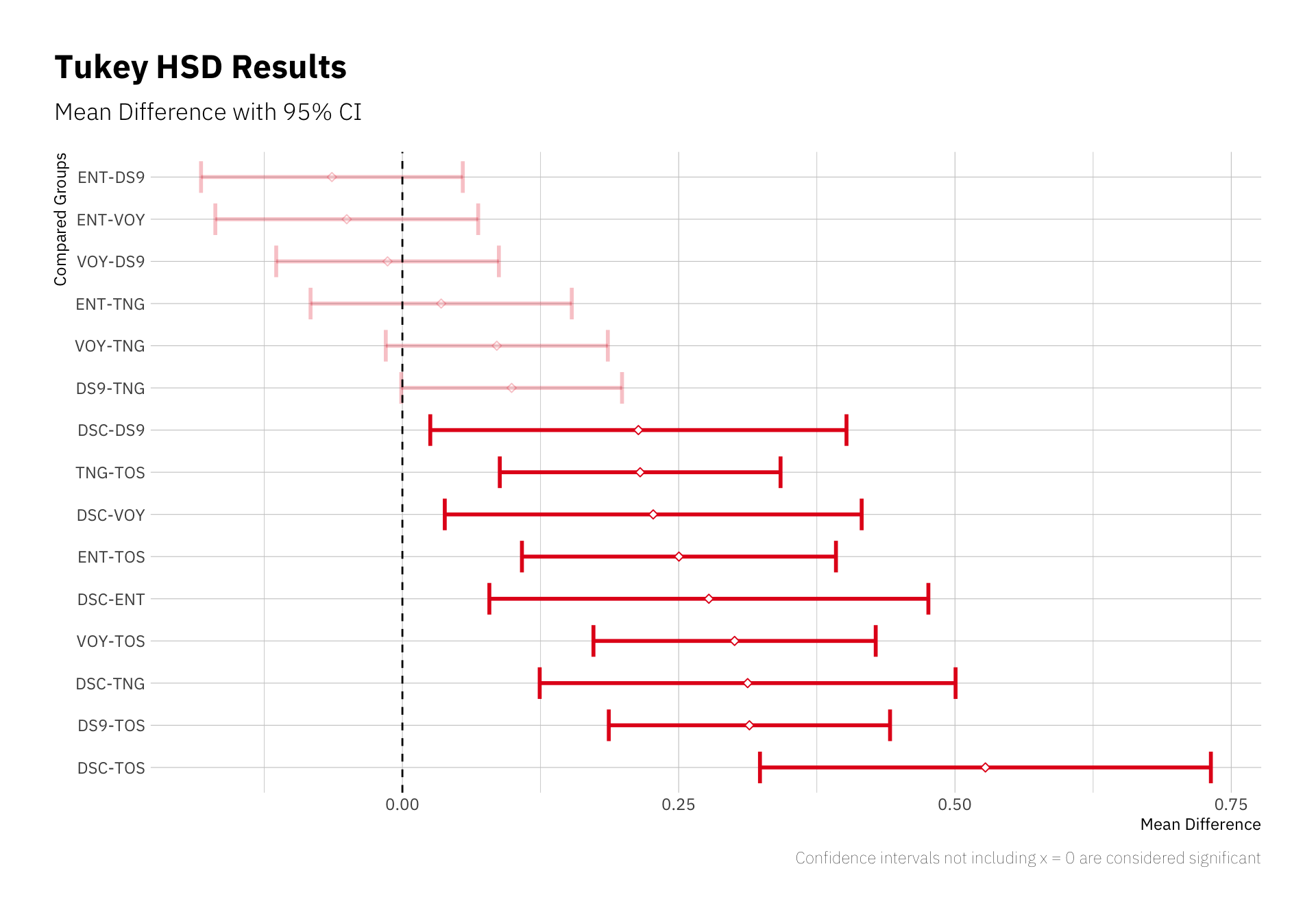 These errorbars indicate which pairwise comparison (e.g. “mean rating of ENT minus mean rating of DS9” in the first row) results in a significant difference from 0, assuming that if the shows have the same mean rating, the difference would be 0. The direction of the difference is determined by the labels to the left, as mentioned, so we can say that TOS is “significantly worse” than Voyager, at least according to mean episode ratings and variation.