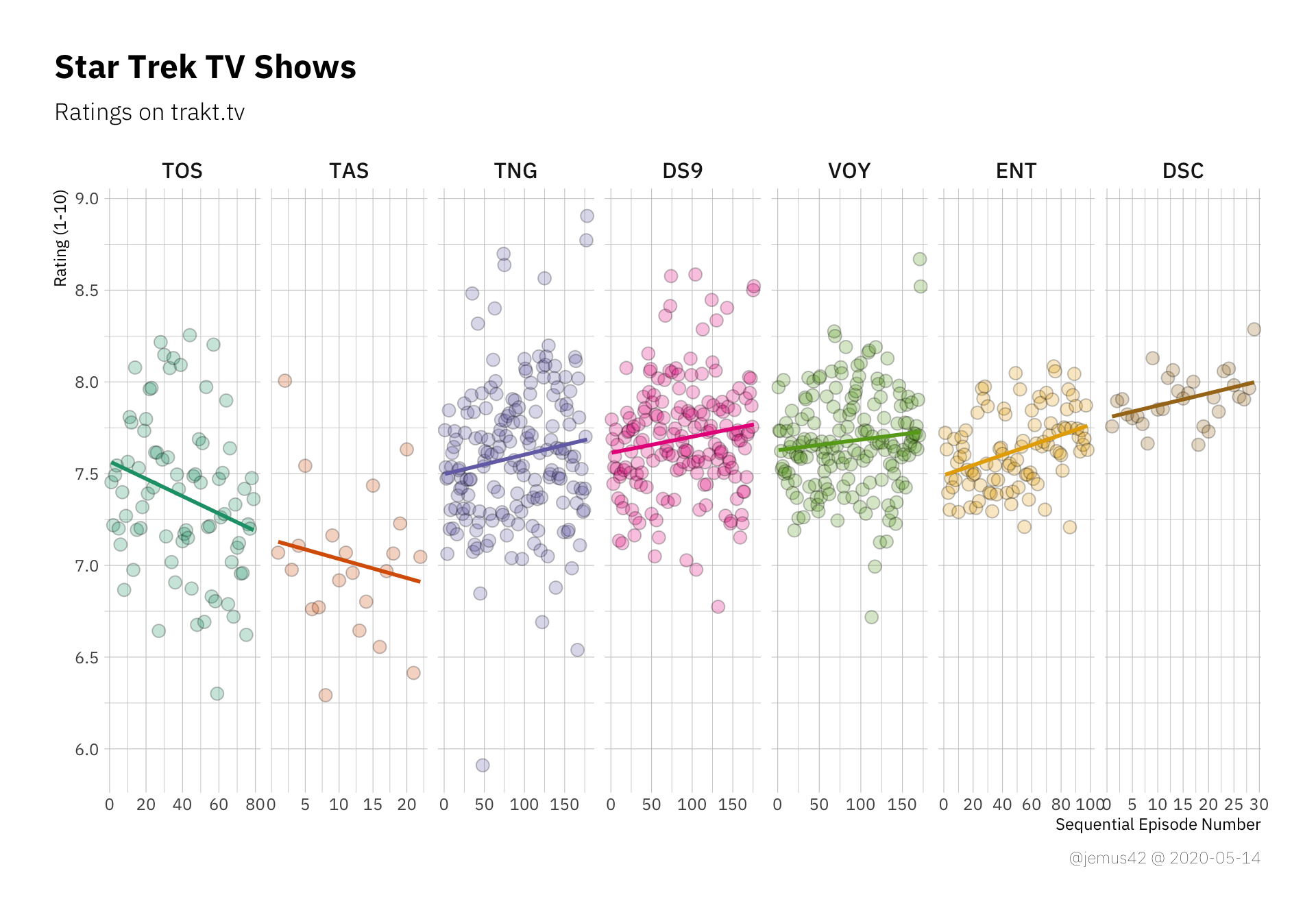 You might notice a few trends, like TOS getting technically worse over time, while DS9 and ENT seem to be getting better over time. I vaguely remember analyzing the seasonal trends of ENT in an earlier blogpost, where I also did some simple statistics to “prove” that the show gets better over time. We can make these trends a little more explicit by using simple linear regression to approximate the ratings over time, where time is just the sequential episode number. A rising trendline would indicate the show getting better towards the end and vice versa. It’s a little too early to evaluate Discovery in this manner, but at least we can see that apparently people really enjoyed the Fall Finale™. In other news, I think it’s safe to say that apparently nobody liked TAS, so… yeah. There’s that.