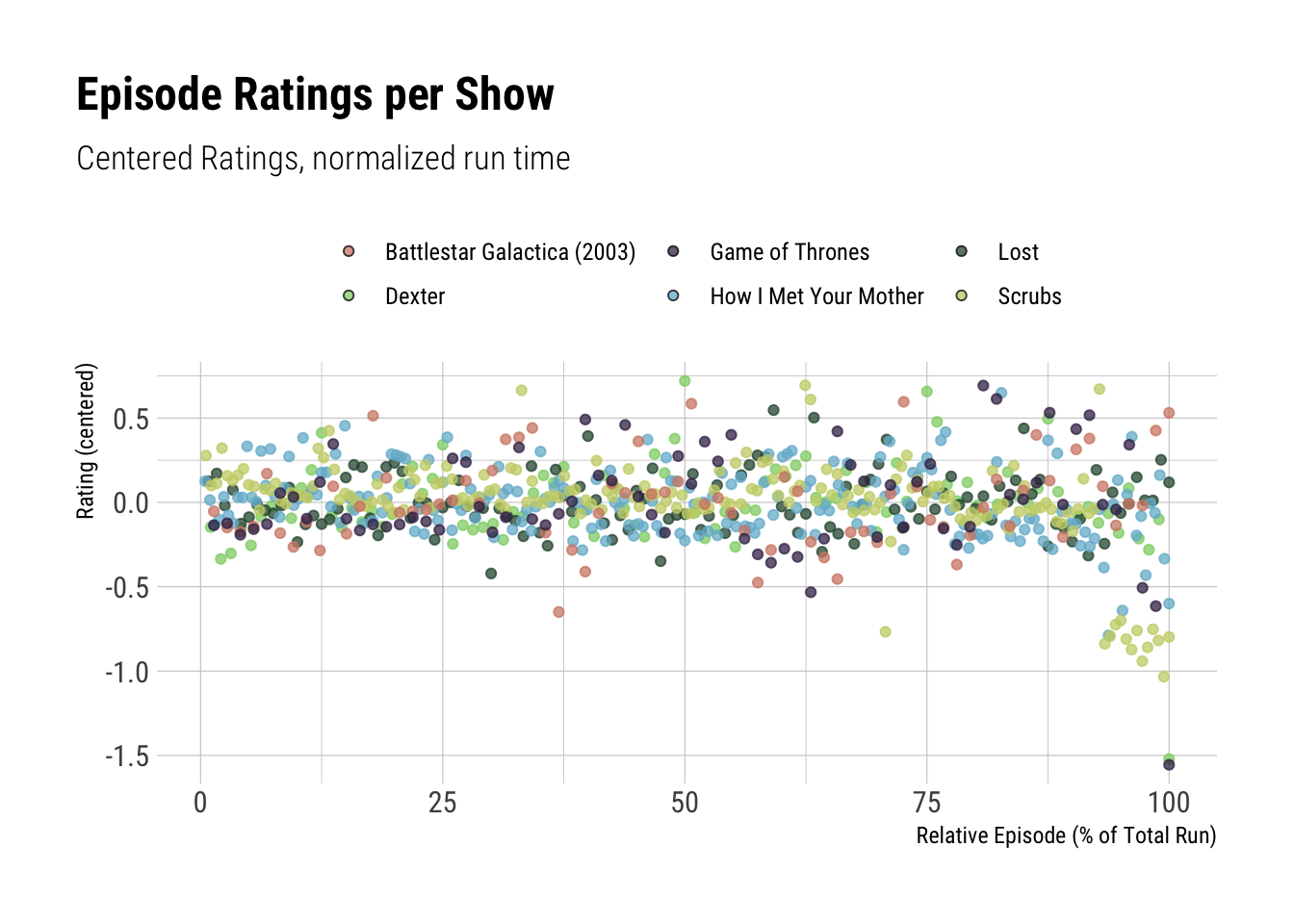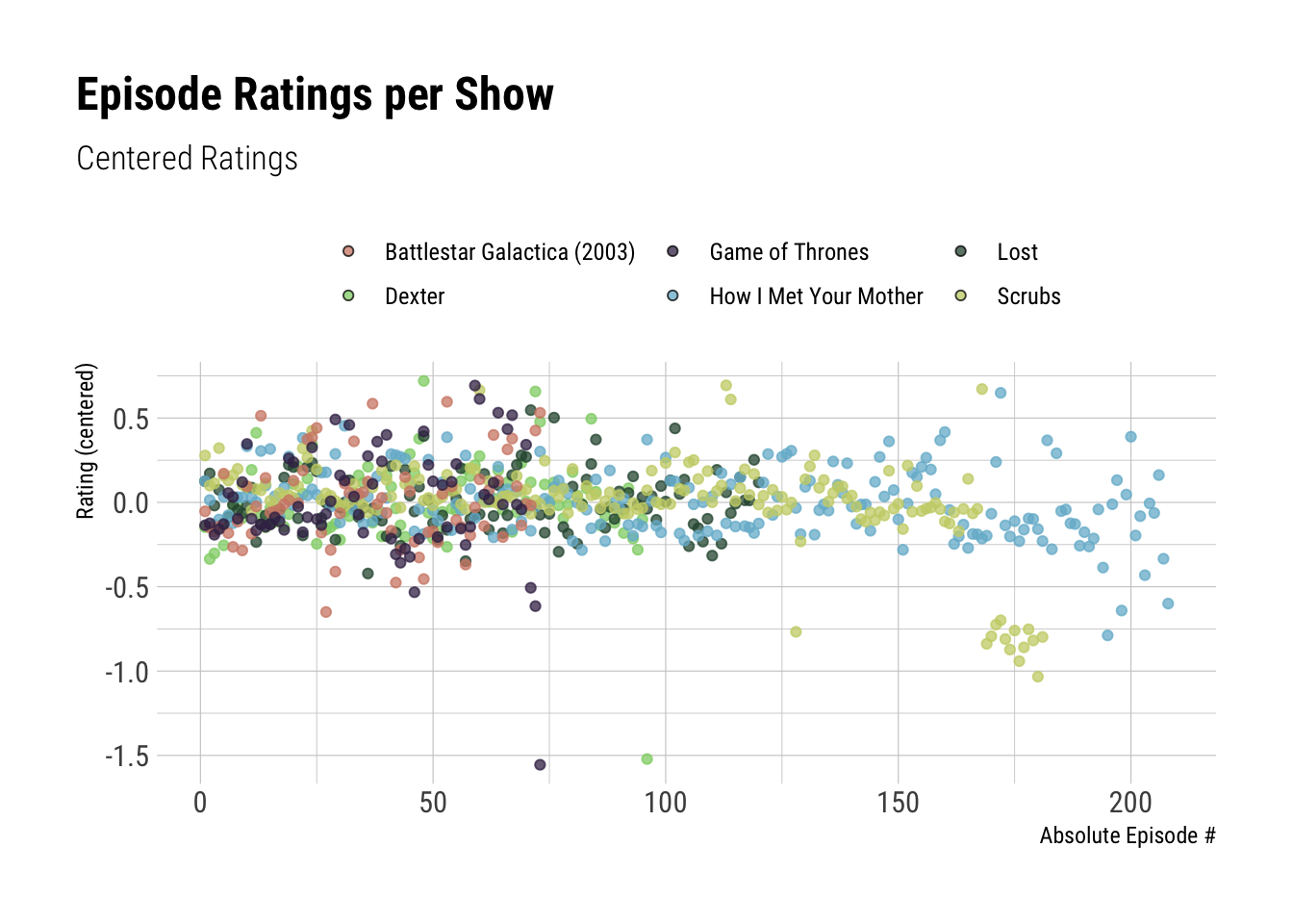 Since I’m primarily interested in the rating of the ending compared to the average for the specific show, we’ll standardize the ratings using mean and standard deviation of each show. Just in case, we’ll get both centered and standardized ratings.