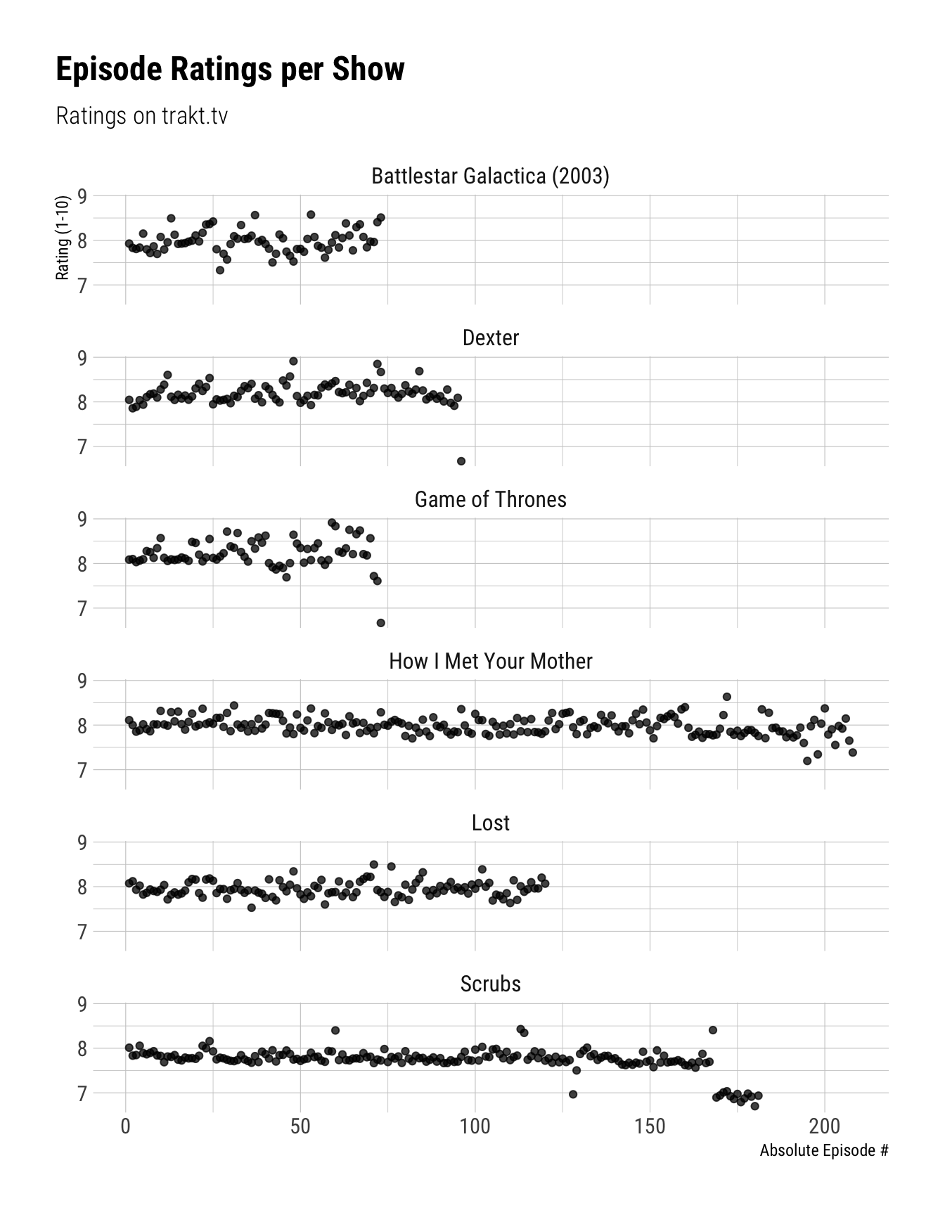 shows<-tribble(~show,~slug,"Dexter","dexter","Lost","lost-2004","How I Met Your Mother","how-i-met-your-mother","Scrubs","scrubs","Battlestar Galactica (2003)","battlestar-galactica-2003","Game of Thrones","game-of-thrones")if(!file.exists("episodes.rds")){episodes<-purrr::pmap_df(shows,~{trakt.seasons.summary(.y,extended="full",episodes=TRUE)%>%pull(episodes)%>%bind_rows()%>%select(-available_translations)mutate(show=.x,season=as.character(season),episode_abs=seq_along(first_aired))})saveRDS(episodes,"episodes.rds")}else{episodes<-readRDS("episodes.rds")}