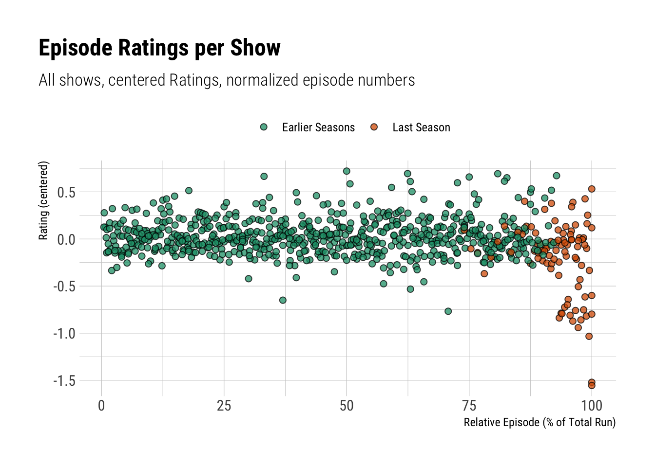 Now we’ll look at the previous plot, but highlight the last seasons of our shows: