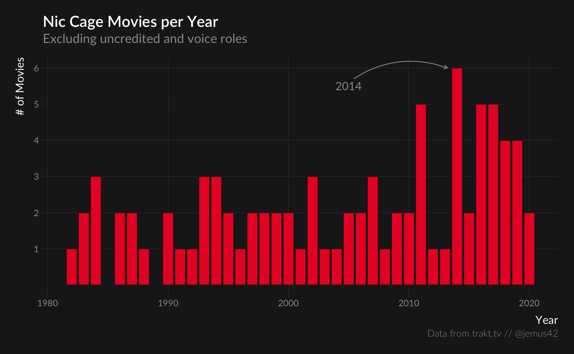 cage_movies%>%count(year)%>%ggplot(aes(x=year,y=n))+geom_col(color="#1D1D1D")+annotate("text",x=2005,y=5.5,label="2014",color="#999999",size=5,family="Lato")+annotate("curve",color="#999999",curvature=-.25,x=2005.4,y=5.7,xend=2013.2,yend=6,arrow=arrow(ends="last",length=unit(5,"pt")))+scale_y_continuous(breaks=seq(1,10,1))+labs(title="Nic Cage Movies per Year",subtitle="Excluding uncredited and voice roles",x="Year",y="# of Movies",caption=plot_caption)+theme_trakt()